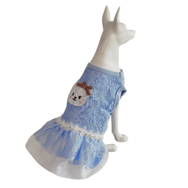 Vestido de encaje con estampado de osito, cuenta con detalle de perlas en la cintura y falda tipo tutú. Material: Poliéster Color: Palo rosa, azul Disponible: Razas pequeñas