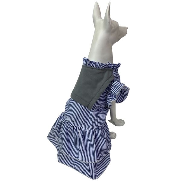 Vestido para mascotas con estampado de rayas y con cuello estilo babero. Material: Poliéster Color: Azul, gris Disponible: Razas pequeñas