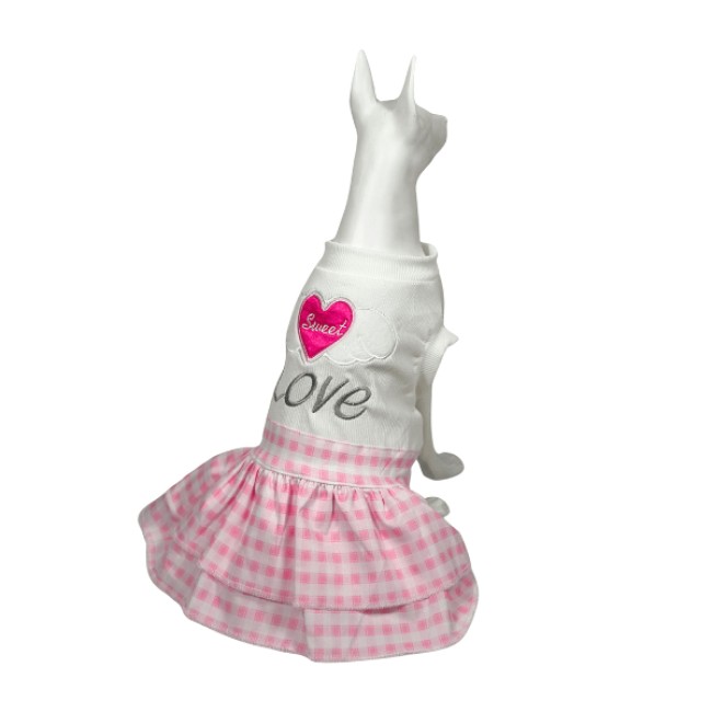 Vestido estampado de corazón con alas y detalle de falda a cuadros. Material: Poliéster Color: Rosado, morado Disponible: Razas pequeñas