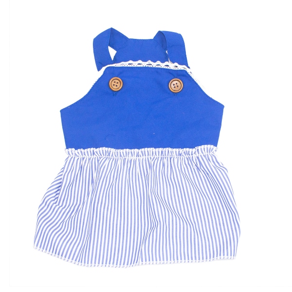 Vestido a rayas con detalles bordados y tirantes con botones. Material: Poliéster Color: Morado, café, azul Disponible: Razas pequeñas y medianas